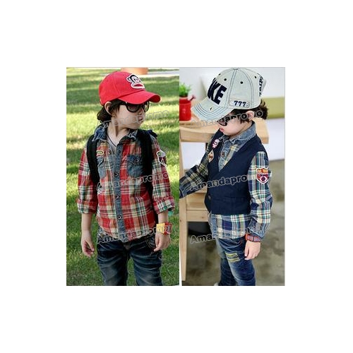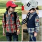 Children's Long Sleeve Grid Embroider Chapter Flax Lapel Shirts |