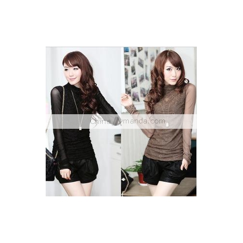 Europe And America Style Women's Pure Color Hign Neck Lace T-shirt |