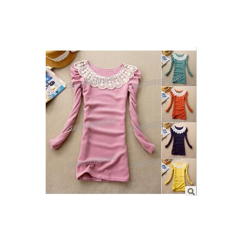 Item no: 2320 style: long sleeve collar: round brought design: the pure color style: fair maiden color classification: yellow pea green orange pink size: all code season: spring autumn winter material: cotton + spandex sleeve type: conventional design details: lace length: long style in (length 50-70 CM)
